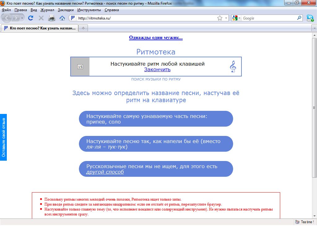 Пожалуй, из всех рассмотренных при подготовке статьи проектов этот показался нам самым необычным. «Ритмотека» предлагает пользователю искать музыкальные произведения, отстукивая их ритм. Согласитесь, ведь как часто бывает — вам понравилась услышанная случайно мелодия, но ни ее названия, ни имени исполнителя вы не запомнили. Как найти ее в Интернете? Конечно, при наличии микрофона и знании слов ее можно напеть — существуют англоязычные сервисы для такого поиска музыки. Но есть и более оригинальные способы: на сайте ritmoteka.ru пользователю предлагается отстукивать ритм музыкальной композиции с помощью клавиатуры или кнопки мыши.