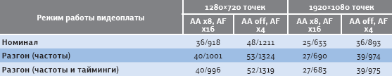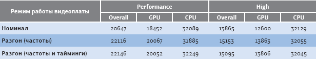 Для начала мы определили предельно допустимые значения частоты памяти и ГП: 1011 и 5079 МГц соответственно. При этом питающее напряжение ГП пришлось поднять со штатных 1,2 до 1,304 В, а памяти — с 1,65 до 1,72 В. Стабильность системы определялась с помощью стресс-теста FurMark. Для оценки производительности видеоплаты были использованы только синтетические «бенчмарки». Выяснилось, что разгон дал ощутимый прирост производительности. Потом мы решили изменить тайминги памяти. Программа позволяет делать это в широких пределах, однако мы выбрали один из предустановленных профилей с минимальными значениями. Для сохранения стабильности нам пришлось снизить частоту до 4973 МГц, в результате чего показатели в тестах уменьшились. Очевидно, ручная настройка таймингов требует более тщательного подхода.