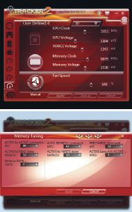 Частота работы ГП поднята со штатных 850 до 894 МГц. В комплект поставки входит программа ASUS iTracker 2, позволяющая осуществлять самостоятельный разгон платы, в том числе регулировать питающие напряжения ГП и памяти, а также тайминги.