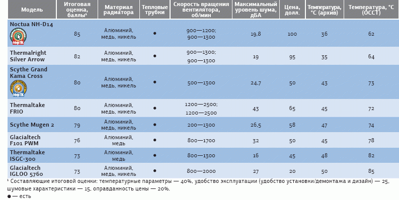 Как показали испытания, почти все протестированные охладители успешно справляются со своей задачей, обеспечивая достойный отвод тепла. Но больше всего нам понравился Noctua NH-D14, который показал весьма впечатляющие результаты. Ему мы и присуждаем значок «Выбор редакции». Разумным же выбором при не самой высокой цене, на наш взгляд, является охладитель Scythe Grand Kama Cross, который получает значок «Лучшая покупка».