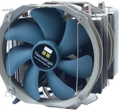 Гигантомания оказалась не чужда и компании Thermalright. Ее творение получилось еще более массивным, нежели Noctua NH-D14, хотя по форме и напоминает его. Но здесь, в отличие от соперника, использованы два низкоскоростных 13‑см вентилятора. Оба блока изогнутых ребер (по 55 пластин каждый) насажены на четыре никелированные тепловые трубки, соединенные с основанием.
