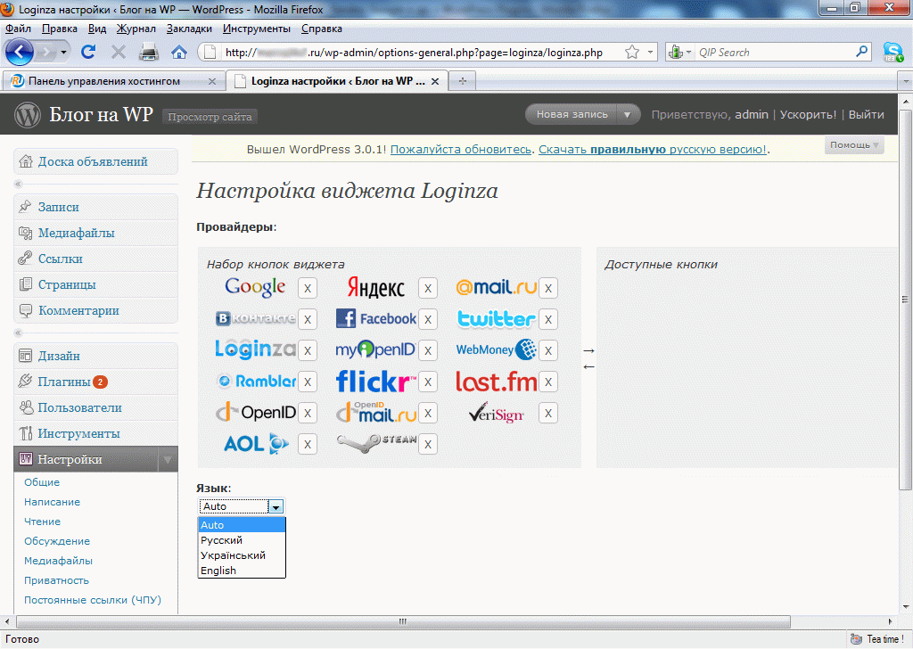 Для веб-разработчиков Loginza -- это виджет, написанный на JavaScript, который легко вставить на любую страницу сайта. Для этого потребуется добавить несколько строк в код страницы. Разумеется, виджет Loginza можно настроить так, чтобы можно было отображать лишь кнопки некоторых провайдеров учетных записей, а также выбрать язык (на момент написания статьи были доступны только русский, украинский и английский). Имеются и готовые плагины Loginza для таких популярных платформ, как WordPress, Drupal, Joomla и phpBB.