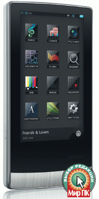Экран выполнен по емкостной технологии и поддерживает сенсорное управление. Меню реализовано неплохо, оно напоминает примененное в модели YP-М1, рассмотренной в «Мире ПК», № 2/10. Допустимо изменять темы, а также имеются разнообразные виджеты. Удобно реализована возможность оставлять заметки прямо на панели меню. Однако компактные размеры ухудшают удобство управления — периодически попадаешь не туда, куда нужно, причем особенно ярко это проявляется тогда, когда необходимо перемотать фильм или аудиотрек до какого-то определенного момента.