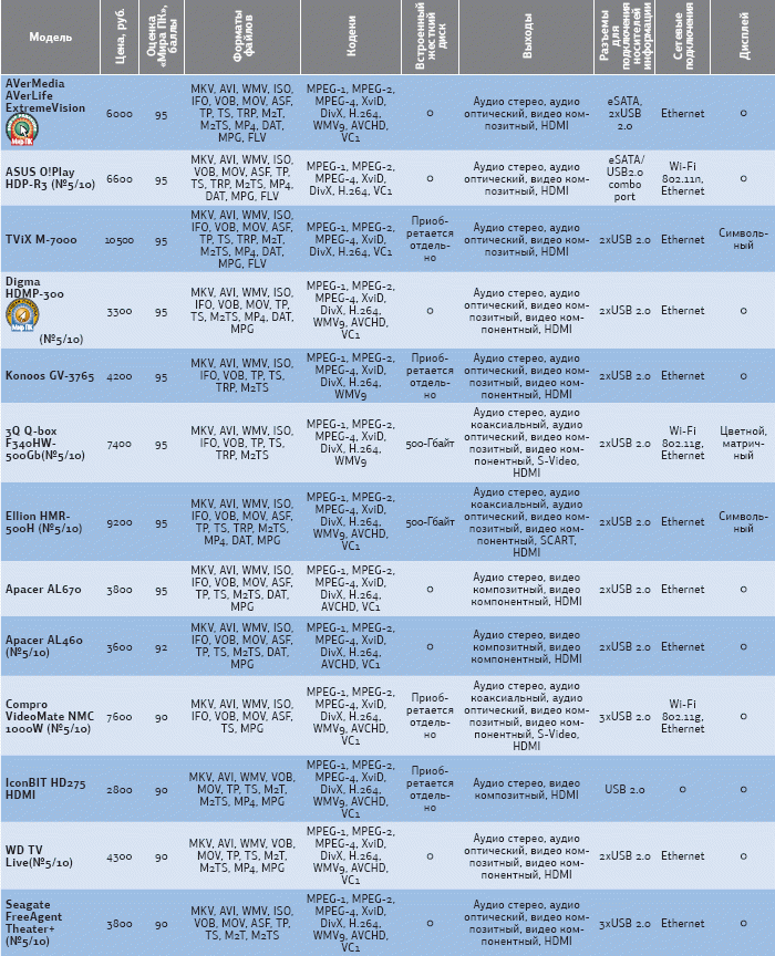 Что же касается наших предпочтений, то «Выбор редакции» получает модель AVerMedia AVerLife ExtremeVision. На наш взгляд, этот аппарат оказался наиболее интересным и функциональным. А вот значок «Лучшая покупка» по-прежнему остается у Digma HDMP-300 — при весьма умеренной цене данное устройство обладает всеми возможностями современного медиацентра.