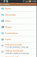 Одно из самых полезных приложений для мобильного пользователя — это, пожалуй, DropBox. Клиентская часть данного ПО позволяет получить доступ к сетевому хранилищу данных. При регистрации дается 1 Гбайт пространства на сайте www.dropbox.ru, с которым можно обмениваться информацией как через веб-интерфейс, так и через программы-клиенты, доступные для различных ОС, включая Android.