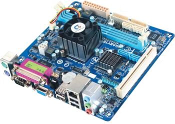 Таким образом, по маркировке системной платы Gigabyte GA-D525TUD легко определить, что она построена на настольном процессоре с двумя ядрами. Причем в ассортименте Intel уже имелся процессор Atom D510, а значит, необходимо выяснить, в чем разница и зачем платить больше. Итак, главное различие скрывается в контроллере ОЗУ: 525‑й процессор поддерживает память типа DDR3. Кстати, рабочая частота памяти ограничена 800 МГц, что слегка охладило наши надежды на высокий прирост производительности по сравнению с D510. Помимо того, тактовая частота была поднята с 1,66 до 1,8 ГГц. Несмотря на ее повышение, производитель не увеличил заявленное значение энергопотребления, равное 13 Вт. Следовательно, модели D510 и D525 являются самыми «горячими атомами» (самый «холодный» представитель, Z500, потребляет 0,65 Вт при тактовой частоте 800 МГц, но со старым чипсетом Intel 945GU).