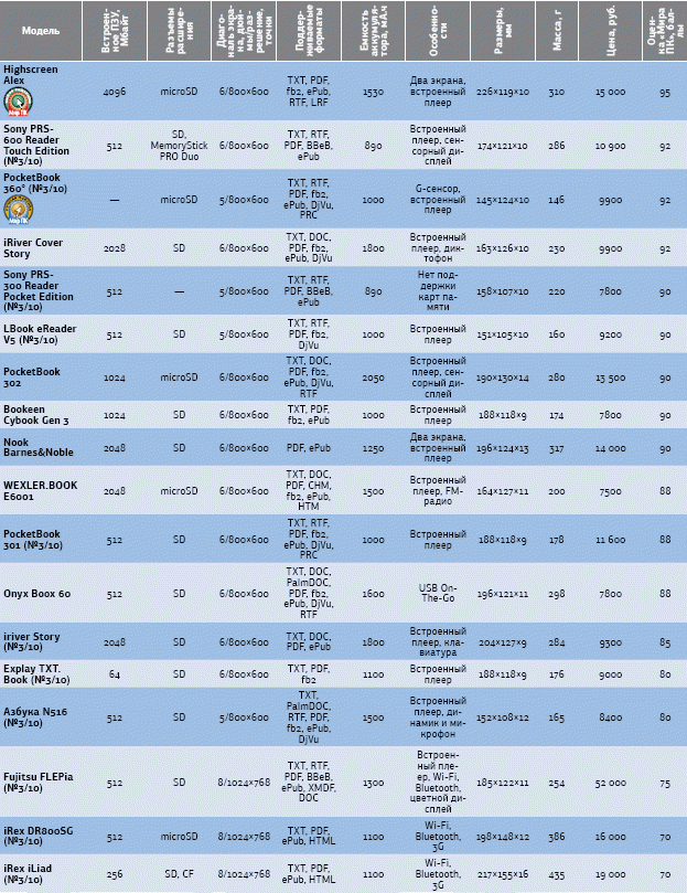 Что же касается наших рекомендаций, то наиболее функциональной и инновационной мы посчитали модель Highscreen Alex, получившую значок «Выбор редакции», тогда как «Лучшая покупка» по-прежнему остается за устройством PocketBook 360°: на наш взгляд, эта «книжка» имеет отличные показатели при весьма умеренной цене.