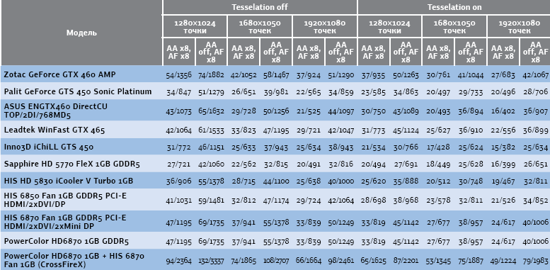 Испытания мы проводили на нашем привычном тестовом стенде на основе процессора Intel Core i7 980X под управлением 64-разрядной ОС Microsoft Windows 7 Ultimate. Для измерения производительности наряду с синтетическими тестами 3DMark Vantage и Heaven Benchmark были также установлены две игры, использующие DirectX 11, — Metro 2033 и Mafia 2, и еще одну на основе DirectX 10 — Resident Evil 5.