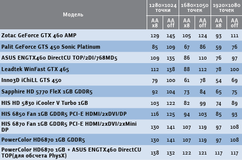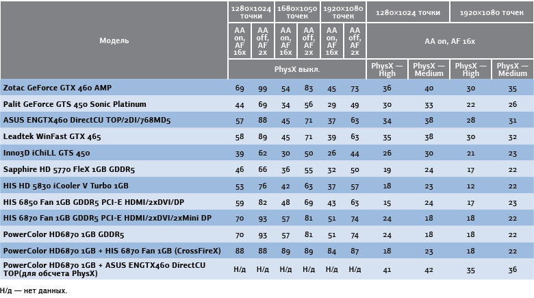 К счастью, для пользователей видеоплат AMD, желающих испытать PhysX, существует обходной путь. Энтузиаст, известный под ником GenL, в конференции на сайте www.ngohq.com создал патч, позволяющий обойти искусственное ограничение драйвера PhysX и использовать так называемый гибридный режим, когда за расчет физики отвечает плата NVIDIA, а за визуализацию графики — устройство AMD. Самая свежая версия патча успешно работает с использованными нами новыми драйверами NVIDIA 260.99 и AMD Catalyst 10.10. В гибридном режиме были применены платы Radeon HD 6870 от HIS и GeForce GTX 460 компании ASUS. Прирост производительности заметен в игре Mafia 2, однако в 3DMark результат тестов PhysX аналогичен полученному при расчете на ЦП. Причина этого осталась для нас неясной, впрочем, главное — стабильная работа игр. Данный патч можно найти на диске, прилагаемом к этому номеру журнала, а также на упомянутом выше сайте.