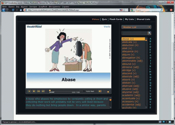 Рабочее пространство пользователя разделено на несколько зон. Основная из них — Study Room. Здесь предлагается просмотреть видеоролики из словаря и пройти тесты, во время которых нужно указать правильное значение слова из предлагаемого перечня. Удобно, что в процессе тестирования после ответа демонстрируется правильный вариант, а также ведется автоматический подсчет набранных баллов. Раздел Flash Cards содержит виртуальные карточки со словами, предназначенными для быстрого просмотра. Их разрешается переворачивать, и на обратной стороне приведены картинка и краткое разъяснение смысла слова. Следует отметить хорошие рисунки и добрую толику юмора в видео, раскрывающие содержание слов. Все это делает обучение на редкость увлекательным.