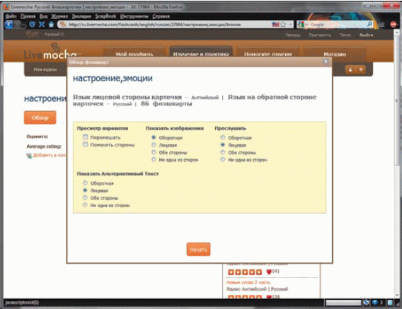 Данный проект обладает независимой от курсов обучения подсистемой работы с карточками, на которых написаны слова и выражения. Причем разрешается пользоваться как собственными их наборами, создаваемыми с помощью предлагаемых инструментов, так и готовыми подборками, составленными другими обучающимися, причем все комплекты можно оценивать. Работа осуществляется в двух режимах: последовательный просмотр карточек и викторины, позволяющие проверить знания. Кстати, разработчики предусмотрели возможность гибкой настройки параметров демонстрации Flash-карточек.