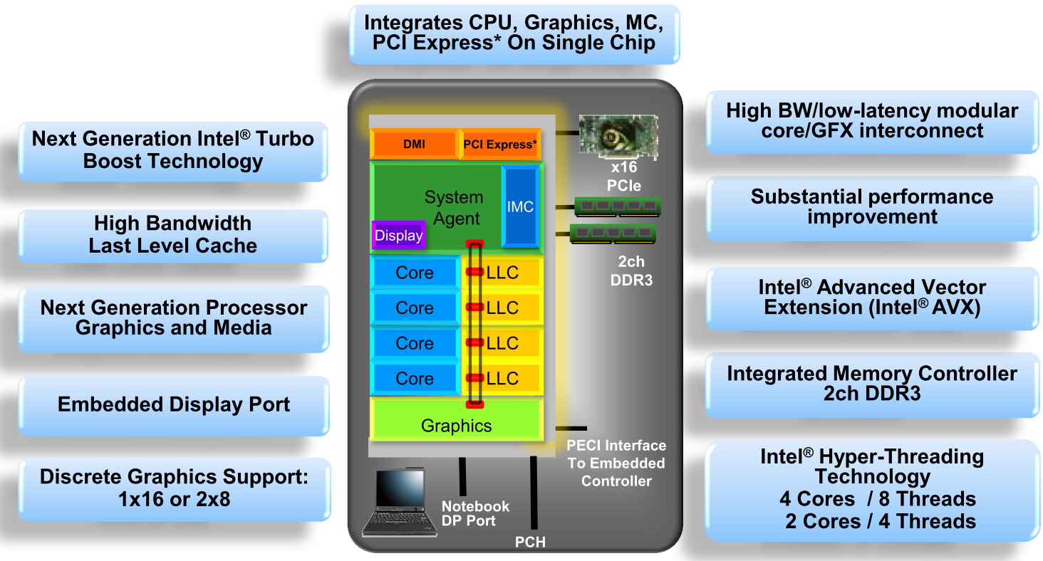 Около года назад на рынке появились процессоры семейства Intel Clarkdale, первые в истории ЦП с интегрированным графическим адаптером. Правда, микросхема Clarkdale состоит из двух кристаллов. На одном из них, выполненном по 32-нм технологии, располагаются два ядра микроархитектуры Nehalem. Другой, изготовленный по 45-нм техпроцессу, играл роль северного моста, т.е. содержал в себе контроллеры памяти и интерфейса PCI Express, а также графическую подсистему. Между собой кристаллы были связаны шиной QPI.