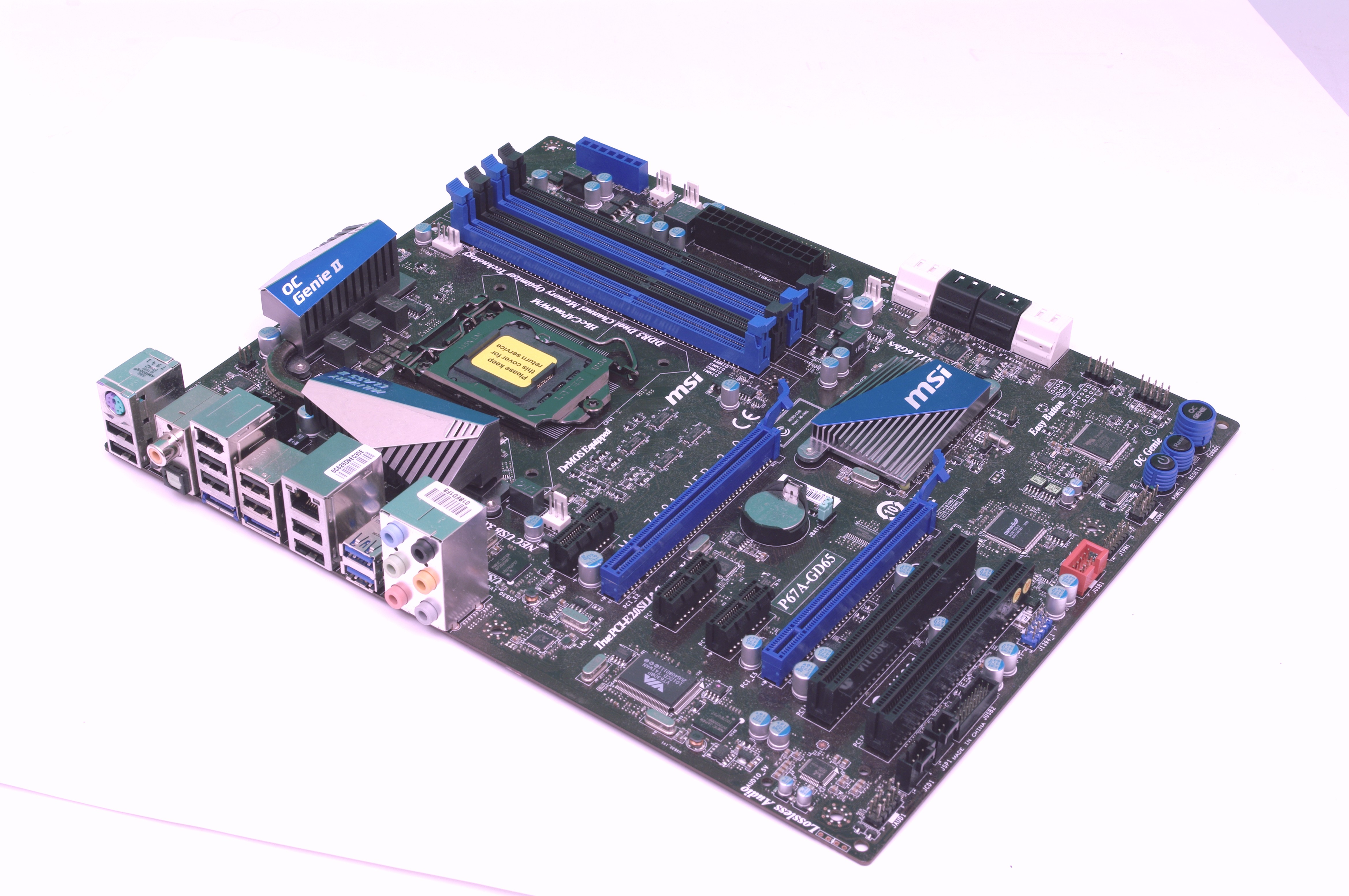 Для проведения тестирования мы использовали две системные платы на разных наборах микросхем. Первая из них, MSI P67A-GD65, в данное время является «топовым» продуктом компании MSI. Она поддерживает массивы ATI CrossFireX и nVidia SLI, имеет контроллер интерфейса IEEE 1394, дополнительный контроллер SATA 3 и два контроллера USB 3.0, один из которых подключается к специальной панели, предназначенной для установки в 3,5-дюймовый отсек.