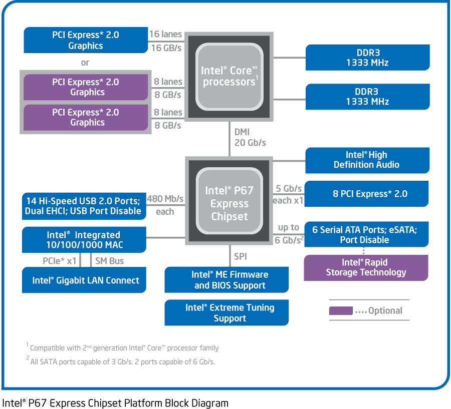 Процессоры Intel Core второго поколения несовместимы с наборами микросхем предыдущей серии. Новая платформа включает в себя два чипсета для настольных ПК: P67 Express и H67 Express. Обе микросхемы РСН (Platform Controller Hub) способны обеспечить до восьми линий PCI Express через порты х1, х2 или х4, до 14 портов USB 2.0, четыре порта SATA 2 и два — SATA 3. Обе они поддерживают режимы RAID 0, 1, 5, 10.