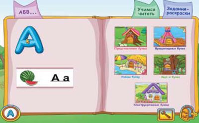 Работа со вторым разделом вообще немыслима без участия родителей. Подробности можно выяснить в пункте «Помощь» или в «Пособии для родителей», прилагаемом к диску. Да и знакомиться с буквами ребенку лучше не в одиночку, хотя с материалом этого раздела он сумеет справиться и без помощи взрослых. На каждую из букв здесь по пять упражнений: «Представление буквы», «Вращающаяся буква», «Найди букву», «Звук и буква», «Конструирование буквы», содержащих по нескольку заданий. Причем в данном случае заниматься всей семьей будет не только веселее, но и продуктивнее. Подробные рекомендации родители найдут в уже упомянутом пособии. Кстати, в нем, наряду с рекомендациями по обучению чтению, есть немало полезных советов, которые помогут познакомить ребенка с основами компьютерной грамотности, использовать буквенные упражнения для обучения счету и т. д.