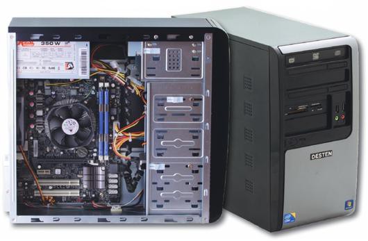 Компьютер компании Desten собран в приятном на вид компактном корпусе. Внутри располагается системная плата формфактора mATX, имеющая два свободных разъема расширения PCI, один PCI Express x1 и один PCI Express x16. Корпус охлаждается одним 120-мм вентилятором. На плате всего два разъема DIMM, так что расширение объема ОЗУ невозможно. Как и все ПК в данном обзоре, Desten eVolution 1433I снабжен памятью DDR3 с рабочей частотой 1333 МГц. Небольшое опасение вызывают распаянные на плате конденсаторы с жидким электролитом. Недостатком конфигурации является слишком слабый блок питания: здесь использован БП компании RealPower мощностью всего 350 Вт. При таком маломощном БП даже при незначительной модернизации может потребоваться заменить его более мощным.