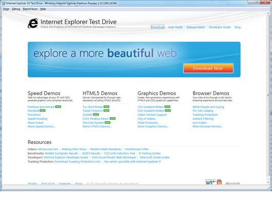 Однако вернемся к IE10. Что же можно ожидать от этого браузера? Microsoft предлагает аппаратное ускорение графики, поддержку HTML5 и интеграцию с ОС для расширения области применения веб-технологий, уже реализованных в IE9. В браузере IE10 появятся средства поддержки развивающихся стандартов: CSS3 Multi-column Layout, CSS3 Grid Layout, CSS3 Flexible Box Layout, CSS3 Gradients и ES5 Strict Mode.