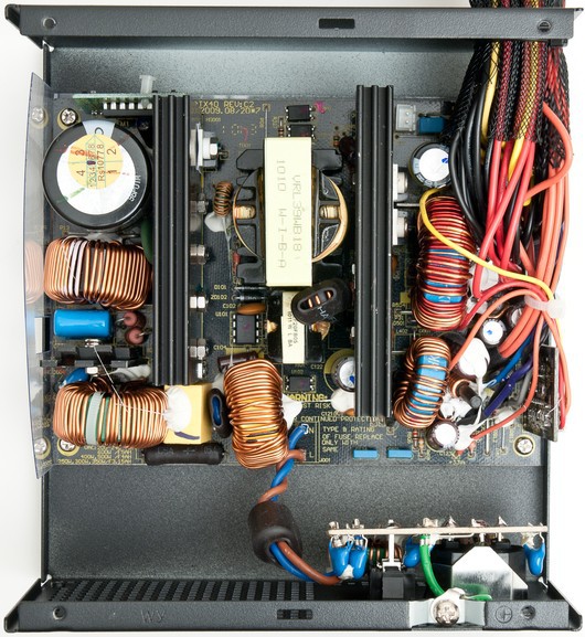 Приходится признать, что начинка блока выполнена не так качественно, как у двух ранее рассмотренных экземпляров, однако каких-либо явных недостатков, вроде нераспаянных элементов, не замечено. Вентилятор, обдувающий радиаторы внутри БП, на одной из сторон снабжен ребрами, направляющими часть воздушного потока к задней стенке блока. Странное решение. Обычно производители, наоборот, стараются не допустить потери «закачанного» в блок воздуха, ориентируя его внутрь, а здесь все иначе. Редкая особенность: от 140-мм вентилятора в БП вовне выпущен 40-см кабель, позволяющий с помощью системной платы контролировать обороты.