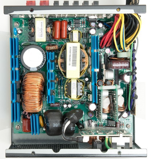 Габариты блока — 140х150х85 мм. Материал корпуса – окрашенная в черный цвет сталь. Внутри нет каких-либо оригинальных схемотехнических решений, но хорошо видно стремление разработчиков максимально снизить шум, издаваемый блоком. Алюминиевые радиаторы с большой площадью оребрения на силовых полупроводниках, термодатчик закреплен на одном из ребер (т.е. далеко от основания). Следовательно, пока радиатор полностью не прогреется, вентилятор не будет повышать обороты. Простое и действенное решение, но только при правильной настройке регулятора оборотов, чтобы не перегреть диодные сборки. В предельных режимах работы они нагреваются гораздо быстрее, чем тепло успевает распространиться по всей площади радиатора и "разбудить» 120-мм вентилятор фирмы ADDA.