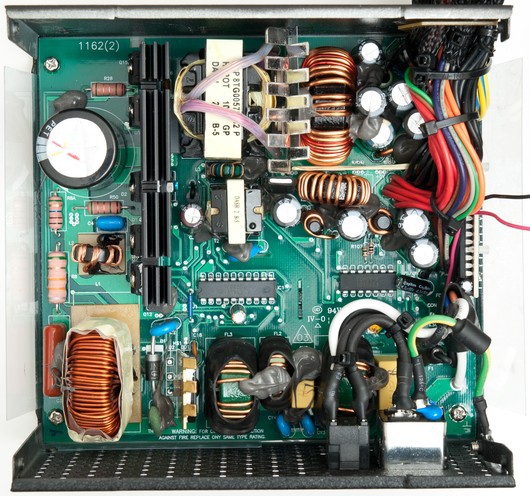 Эта модель поставляется в черной коробке, внутри которой, помимо самого БП, имеются кабель питания, инструкция, винты крепления и несколько стяжек-липучек. Блоки питания серии Aurum совсем не похожи на своих невзрачных предшественников — порошковая окраска с затейливым рисунком, декоративные пластиковые элементы вокруг вентилятора и выхода жгута проводов, узорчатая штампованная решетка. Внутренности новинки также сильно отличаются от моделей прошлых лет: вместо двух больших радиаторов применены один средний в высоковольтной части и еще один совсем маленький в низковольтной, на котором закреплены полевые транзисторы. Остальные силовые полупроводники выпрямителя смонтированы на обратной стороне платы, так как при их незначительном тепловыделении не требуется отдельного радиатора. В общем, есть все необходимое для того, чтобы получить сертификат 80 PLUS Gold, столь популярный в Европе. Габариты блока: 140х150х85 мм.