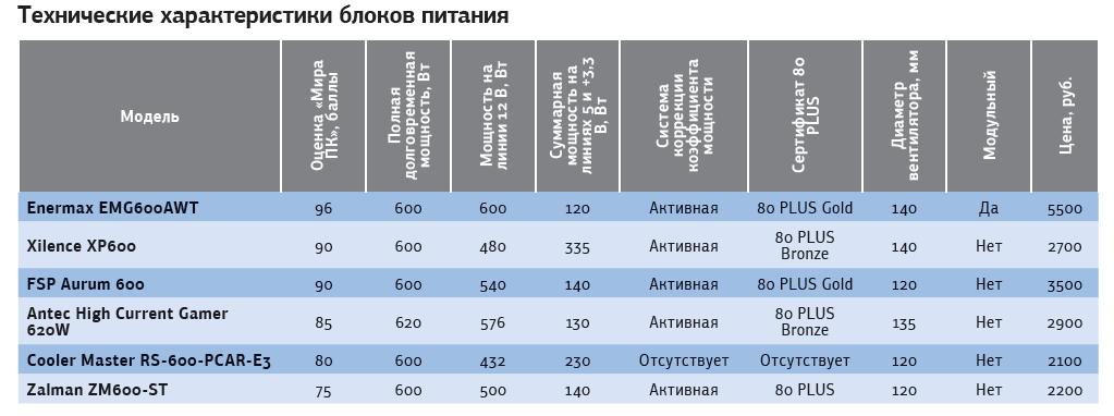 Здесь представлены шесть блоков питания мощностью по 600 Вт. На наш взгляд, такое номинальное значение мощности является оптимальным для настольного ПК. С одной стороны, эти БП способны выдержать нагрузку топовой конфигурации с производительной видеоплатой, а с другой — достаточно просты в изготовлении, да и цены на них невысоки. Испытанные нами блоки произведены известными компаниями Zalman, FSP, Enermax, CoolerMaster и др.