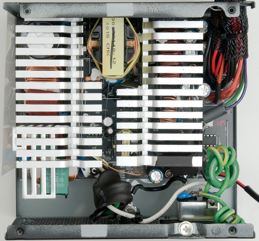 Изделия компании Cooler Master считаются одними из лучших на рынке, и потому она не стесняется устанавливать на них высокую цену. Поступившая на тестирование 600-Вт модель оснащена медными радиаторами (что очень хорошо) и… переключателем для выбора напряжения питания в розетке. Система коррекции коэффициента мощности отсутствует. Хорошо это или плохо? С какой точки зрения посмотреть. По мнению «зеленых», наверное, плохо. Российскому же потребителю критично лишь то, что подстраиваться под вольтаж в розетке придется ручками, да еще нужно будет следить, чтобы кто-нибудь ловко не «пошутил» (залейте переключатель суперклеем). В остальном же начинка радует. Видно, что модель не новая, но исполнена добротно.