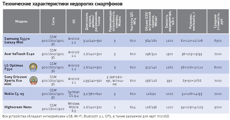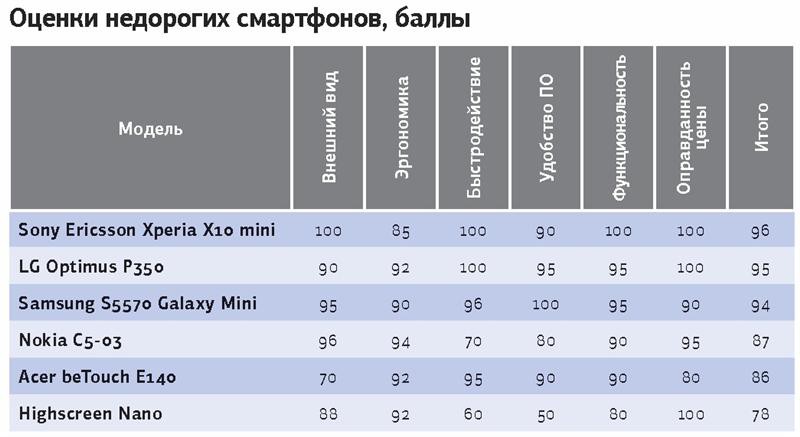 Если вы согласны потратить побольше, рекомендуем приобрести телефон SE Xperia X10 mini, получивший награду «Выбор редакции». Но если столь миниатюрное изделие вам не годится, имеет смысл обратить внимание на LG P350 и Nokia C5-03. У первой модели в плюсе современная ОС Android, у второй -- экран высокого разрешения. После некоторых колебаний мы решили, что титул «Лучшая покупка» заслужил менее дорогой аппарат LG. Сбрасывать со счетов Acer E140 и Samsung Galaxy mini также не следует тем, кто согласен смириться с дизайном и резистивным дисплеем первого и качеством экрана второго устройства, у которого больше диагональ. Как вы можете увидеть по данным в таблице, финальные оценки аппаратов очень близки. Кстати, в наш обзор не вошел смартфон Highscreen Cosmo, поскольку мы отдали предпочтение WM-аппарату той же марки. Но это очень достойная модель за 7000 руб., ведь она оснащена 3,2-дюмовым экраном с разрешением 320х480 точек. Хотя, конечно, не лишена недостатков.