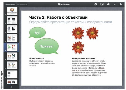 Программа Keynote для iPad позволяет импортировать презентации, созданные с помощью приложения Microsoft PowerPoint или Keynote для OSX, но в обоих случаях в процессе переноса теряются многие детали. Придется распрощаться с кое-какими шрифтами, переходами и анимационными эффектами, которые на iPad недоступны, отказаться от аудиосопровождения и нескольких других элементов. Вместе с тем теперь поддерживаются заметки автора презентации, как созданные на iPad, так и импортированные из PowerPoint и Keynote для Mac. Поэтому, если у вас есть такая возможность, лучше оформлять презентации непосредственно на iPad. При использовании в презентации графических элементов создайте их предварительно на компьютере Macintosh (Apple рекомендует формат PNG), а затем синхронизируйте с iPad с помощью iTunes.