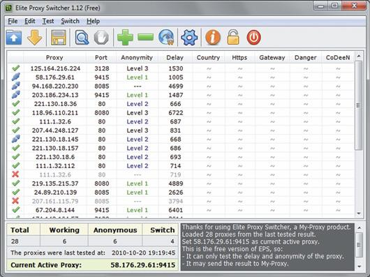 Существует немало платных сервисов, предлагающих доступ к различным видам прокси-серверов («прозрачным», анонимным и элитным). Однако есть и бесплатные. К сожалению, они не всегда стабильны, и потому приходится быть готовым к постоянному поиску новых адресов и переключению настроек своих программ. Для получения списков открытых прокси можно обратиться к таким известным ресурсам, как freeproxylist.org, proxy-list.org, www.checker.freeproxy.ru. Публикуемые списки адресов, как правило, содержат немало информационного шума: соотношение рабочих прокси и общего количества предлагаемых адресов в районе 1:10 -- 1:20 типично для таких списков. Перебирать перечни вручную в поисках рабочих адресов слишком трудоемко, лучше возложить это дело на специальные программы, например на Elite Proxy Switcher. Данное приложение умеет загружать списки адресов прокси в формате TXT и автоматически проверять их работоспособность. Запускается проверка кнопкой Test selected proxies. Все найденные адреса сопровождаются краткой информацией: адрес и тип прокси, а также скорость доступа. Elite Proxy Switcher интегрируется с браузерами Firefox, Internet Explorer и Chrome. Для его переключения достаточно щелкнуть на кнопке дополнения. Когда активный сервер становится недоступен, поддерживается автоматическое переключение прокси по списку. Кроме того, приложение может переключать прокси по расписанию. Соответствующая опция доступна в настройках программы. Платная версия программы способна автоматически подгружать списки адресов прокси, а также обладает расширенными возможностями по их проверке и сортировке.