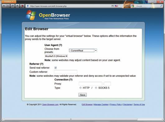 Некоторые веб-прокси располагают набором опций, позволяющих гибко управлять просмотром веб-страниц. Так, Web Proxy (freesurfproxy.org) и SurfWebSafely (www.surf-web-safely.com) предлагают настройки отключения скриптов, мультимедийных объектов, умеют шифровать передаваемые данные, заменять заголовки открываемых веб-страниц и скрывать сведения о браузере клиента. Ресурс OpenBrowser даже способен строить цепочку прокси: в настройках сервиса можно указать адрес еще одного прокси-сервера. Трафик OpenBrowser пойдет через него, что немного повысит приватность пользователя.
