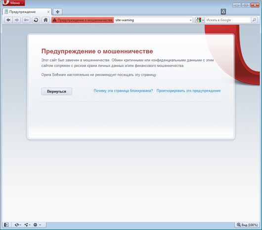 Если веб-сайт найден в черном списке, в браузере откроется страница с предупреждением. Пользователю придется решить, посещать эту подозрительную страницу или вернуться на свою домашнюю. Механизм защиты от мошенничества не оказывает никакого воздействия на скорость открытия веб-страниц.