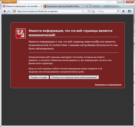 Технология Phishing and Malware Protection проверяет по базе фишинговых и вредоносных сайтов страницы, на которые собирается перейти пользователь. База хранится на компьютере пользователя и обновляется каждые 30 мин, если, конечно, включен сам фильтр Phishing and Malware Protection. А если обнаружено совпадение адреса со списком фишинговых сайтов или сайтов, содержащих вредоносное ПО, Firefox обращается к серверам компаний-партнеров, предоставляющих такие черные списки, и перед блокировкой страницы еще раз перепроверяет, не был ли удален сайт из базы после последнего ее обновления.