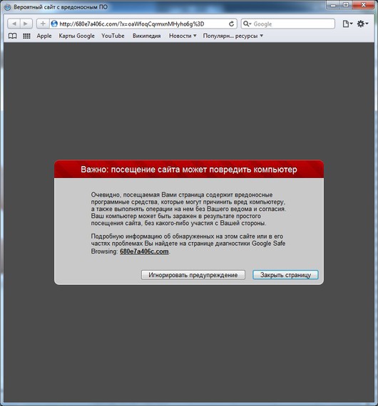 Предупреждение о переходе на сайт, содержащий вредоносное ПО,