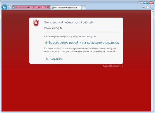 Предупреждение, выдаваемое фильтром SmartScreen в IE9 при попытке