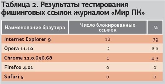 Чтобы ответить на этот вопрос, мы протестировали возможности самых свежих версий браузеров (табл.2). Для этого была отобрана небольшая коллекция из 23 фишинговых сайтов. Ссылки были предоставлены сотрудниками одной из российских антивирусных лабораторий.