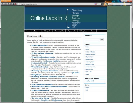 В такой ситуации, для того чтобы найти нужные демонстрации, безусловно, пригодятся проекты-каталоги, коллекционирующие и систематизирующие ссылки на такие сайты. Хорошим стартовым пунктом способен стать каталог Online Labs in (onlinelabs.in). Данный ресурс занимается сбором и систематизацией ссылок на проекты, предлагающие свободно доступные онлайновые эксперименты и лаборатории в различных отраслях наук. Для каждой науки выделен соответствующий раздел. В сфере интересов проекта, прежде всего, физика, химия и биология. Именно эти разделы являются наиболее крупными и хорошо обновляемыми. Кроме того, постепенно наполняются те, что посвящены анатомии, астрономии, геологии и математике. Каждый из разделов содержит ссылки на соответствующие интернет-ресурсы с краткой аннотацией на английском языке, рассказывающей о назначении той или иной лаборатории.