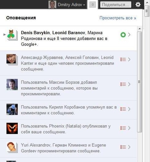 Еще одно удобство – Панель оповещений. В отличие от подобной в Facebook, здесь панель полноценная, а не вспомогательная часть интерфейса. Она может быть открыта постоянно, а содержимое ее будет меняться. Прежде всего там появляются собственно оповещения о включении в круги других пользователей, а также оповещения о появлении новых комментариев в разговоре. Новшество состоит в том, что при переходе к такому разговору он откроется не в главной панели, а в Панели оповещений. Причем не понадобится ни уходить с главной панели, ни возвращаться в нее, чтобы найти место, до которого дочитал. В Панели оповещений можно пролистывать разговоры, в которых участвует пользователь, и добавлять комментарии прямо в ней, что очень удобно. Еще удобнее возвращаться, если надо, к уже состоявшимся разговорам.