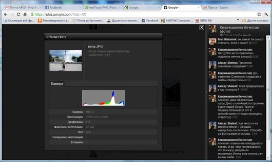 Интеграция. О ней говорилось уже много. Один пример: фотографии пользователей размещаются в Google Picasa – сервисе для хранения и несложной обработки фотографий. Многие пользователи уже отмечали, что появился шанс несколько улучшить качество находящихся там снимков. Поскольку фото в Google+ показываются с помощью Google Picasa, можно посмотреть и их технические данные (они берутся из exif-файла) – такой процесс будет сопровождаться забавной анимацией.