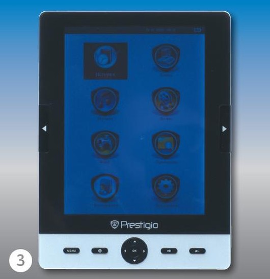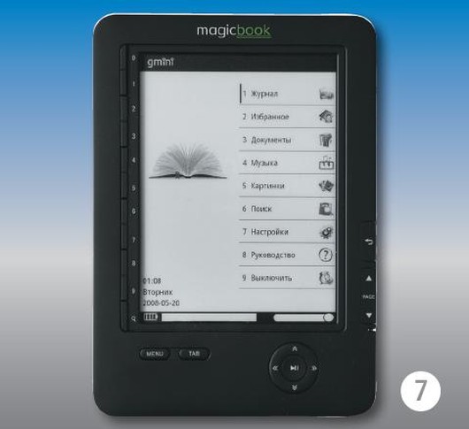По своему виду это устройство немного напоминает «перекормленный» карманный компьютер. Его корпус заметно толще чем у других представленных устройств, да и весит оно немало. И все из-за того, что в него интегрирована батарея значительной емкости (3400 мА.ч), которой, по заявлению производителя, должно хватать на 10 ч чтения текста. Правда, в реальности все же получается немного меньше. Это обусловлено тем, что дисплей устройства выполнен по классической ЖК-технологии. Следовательно, и энергопотребление у него значительно выше, чем у E-Ink. Как водится, экран способен отображать цвет, благодаря чему можно с комфортом просматривать видеоролики и фотографии. Диагональ дисплея равна 7 дюймам, разрешение составляет 600х800 точек. Правда, он имеет глянцевое покрытие и бликует весьма неплохо, а кроме того, на нем любые загрязнения гораздо заметнее, нежели на матовом. Внушительный корпус дополнен элегантным чехлом-книжкой из кожзаменителя, который также может использоваться как подставка.