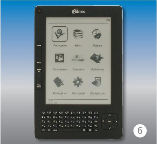 Компания Ritmix не так давно занялась выпуском устройств для чтения электронных книг, но в ее арсенале уже есть несколько моделей. У этого привлекательного на вид аппарата корпус выполнен из пластика с приятным на ощупь бархатистым покрытием. Правда, оно не слишком стойкое к внешним воздействия, особенно по краям. Диагональ дисплея составляет 6 дюймов при разрешении 600х800 точек и цветопередаче в 16 градаций серого.