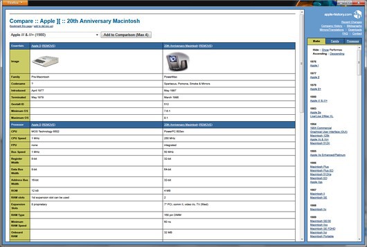 Основа данного проекта -- скрупулезно собранный каталог продукции Apple. Навигация, вынесенная на боковую панель, выполнена в виде хронологического списка. В него включены не только устройства, выпущенные Apple, но и знаменательные события из истории компании, например выпуск известного рекламного ролика 1984 г., срежиссированного Ридли Скоттом. При желании каталог можно отсортировать по семействам процессоров. Интересная опция Apple History -- возможность сравнения различных устройств из каталога. Система строит таблицу, куда допустимо включить до четырех различных экземпляров для оценки.