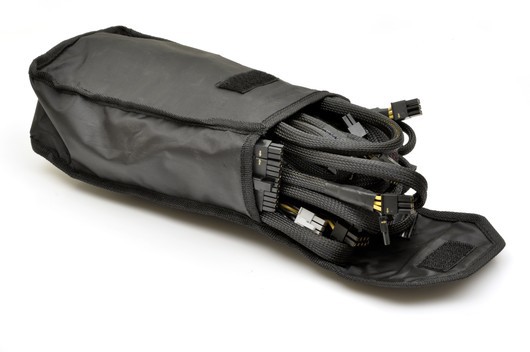 В черно-желтой картонной коробке находились пенопластовый «саркофаг», скрывающий БП, матерчатый чехол, полный проводов, кабель питания, инструкция пользователя и четыре винта крепления. Первое, что бросается в глаза при осмотре ZX1250W, -- сплошные разъемы, ни одного неотключаемого кабеля. Очень неудобно при транспортировании и установке в тесный корпус -- как правило, хотя БП и удается запихнуть с первого раза, шнуры постоянно цепляются угловатыми разъемами.