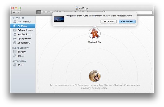 Начнем с очевидного. AirDrop позволяет передавать файлы между компьютерами Mac посредством Wi-Fi. При этом не нужно ничего настраивать, подключаться к маршрутизатору, открывать папки для общего доступа. Достаточно открыть Finder и выбрать соответствующий пункт. Далее происходит автоматический поиск доступных в радиусе 10 м компьютеров. Потом просто перетаскиваем файлы на нужный Mac, что очень удобно. Идем дальше.