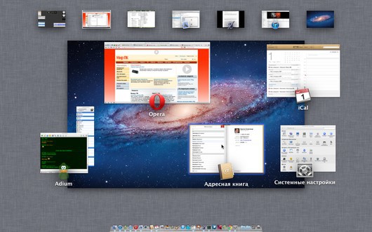 На смену прежним Рабочим столам и Expose пришла новая функция Mission Control, которая объединила их и упростила работу. Чтобы ее вызвать, нужно лишь провести вверх тремя пальцами по трекпаду сенсорной панели. В верхнем ряду экрана Mission Control отобразятся миниатюры полноэкранных приложений, Dashboard и Spaces. В нижней его части представлены все открытые окна -- так же, как в Expose. Кроме того, между областями Mission Control можно перемещаться, смахивая тремя пальцами вправо или влево. А интереснее всего то, что полноэкранные приложения теперь создают отдельный Рабочий стол. Это позволяет, не выходя из данного режима, просматривать почту или сообщения ICQ.