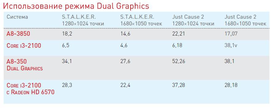 Лично мне тесты Just Cause 2 и Pripyat не нравятся. Существует много других тестовых примеров, а полученные здесь цифры не вполне точно отражают реальное положение дел. Однако они вполне могут служить иллюстрацией мощи платформы интегрированной графики Lynx. При выборе решения Intel вам нужно просто подобрать дополнительную графическую плату, а AMD придерживается более гибкого подхода (предлагая обойтись одним графическим компонентом или объединить ресурсы двух графических процессоров, присвоив им упрощенное обозначение).