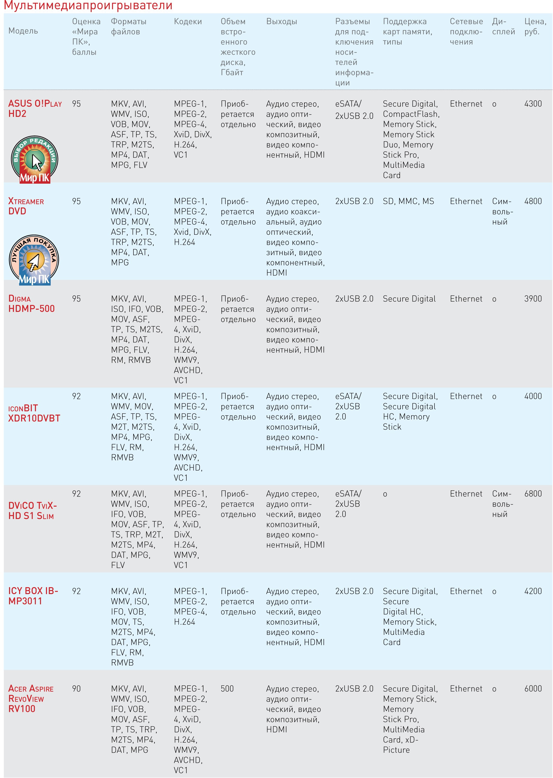 Протестировав семь устройств, представленных на российском рынке, мы пришли к заключению, что все они в состоянии обеспечить пользователя приятными минутами просмотра видеофильмов на большом экране домашнего телевизора. Что же касается наших предпочтений, но «Выбором редакции» стал проигрыватель ASUS O!Play HD2. Несмотря на определенные замечания, касающиеся практичности корпуса, мы проголосовали за этот аппарат, так как он оказался наиболее функциональным. Естественно, немалую роль сыграло и наличие современного интерфейса USB 3.0, отсутствующего у других протестированных нами плееров. А вот «Лучшей покупкой» мы посчитали Xtreamer DVD -- при относительно умеренной цене эта модель обладает всеми возможностями современного медиацентра, включая полноценный DVD-проигрыватель.