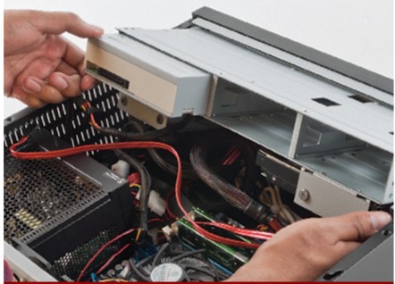 • Если вы решите установить другой дисковод для оптических дисков, убедитесь в том, что он имеет стандартную форму, а кнопки расположены в привычных местах. Некоторые накопители Blu-ray имеют причудливые скосы и смотрятся очень красиво, но есть риск, что они не впишутся в дверцу корпуса nMediaPC.