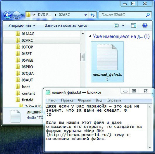 Итак, секрет августовского номера наконец-то был найден нашими внимательными читателями. Кстати, отыскать его, пожалуй, не составляло большого труда. Нужно было лишь просмотреть содержимое диска с помощью любого файлового менеджера -- и в папке 02ARC обнаружился бы «лишний_файл.txt». Некоторые даже испугались этого незваного гостя и, прежде чем открывать, решили его проверить антивирусом. Обнаружили его DmitryAH и mrCat, которым мы и вручим памятные подарки.