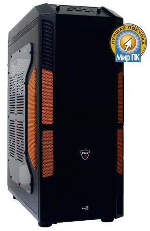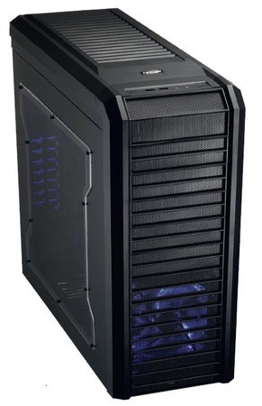 В данном решении производитель пошел на нестандартный шаг, использовав для оформления корпуса черный шероховатый пластик, за счет применения которого в сочетании с сетчатыми вставками изделие выглядит броско и необычно. Большая часть левой стенки сделана из прозрачного пластика, что понравится любителям подсвечивать внутренности системы, используя светодиоды. Все дополнительные интерфейсы выведены на верхнюю часть, их, правда, не так много, как того хотелось бы. Кнопки включения питания и перезагрузки стоило бы выделить, например, цветом, а то они сливаются с корпусом. Ножки, обеспечивающие устойчивость, в этой модели сделаны из резины, что помогает гасить возникающую в процессе работы вибрацию. Производитель неплохо продумал и систему вентиляции. Здесь уже установлено несколько малошумных вентиляторов, причем большая часть из них снабжена светодиодной подсветкой. Находящийся в передней части и работающий на вдув охладитель выполнен из прозрачного пластика и подсвечивается светодиодами при работе. Выглядит это весьма приятно. Расположенные в верхней части вентиляторы -- они, кстати, тоже используют иллюминацию -- неплохо бы защитить съемными фильтрами. А на тот случай, если пользователь решится применить еще и систему жидкостного охлаждения, на задней панели предусмотрено отверстие для шлангов, правда всего лишь одно.