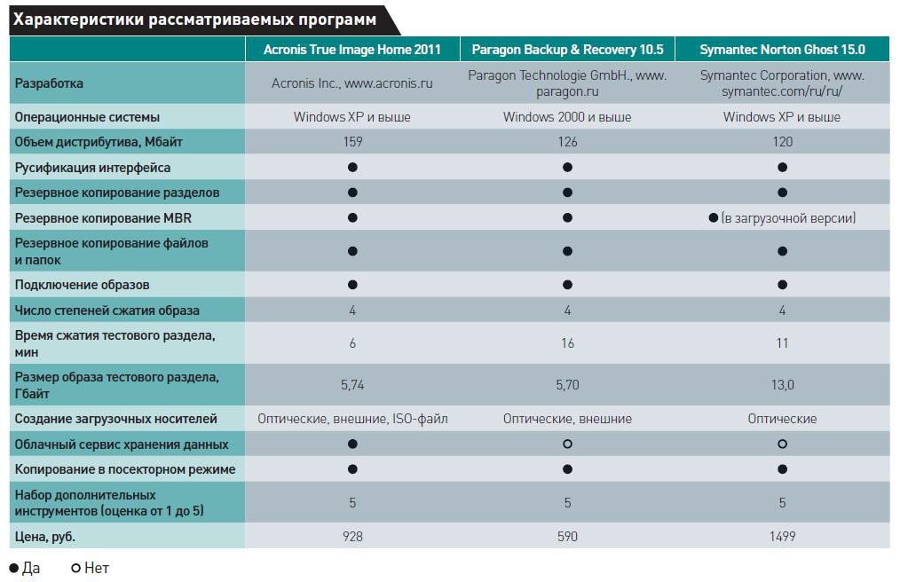 При тестировании программ мы создавали 10,4-Гбайт архивную копию системного раздела в файловой системе NTFS (файл подкачки хранится в другом разделе). Время создания резервных копий, размер полученных архивов и дополнительные программные функции указаны в таблице.